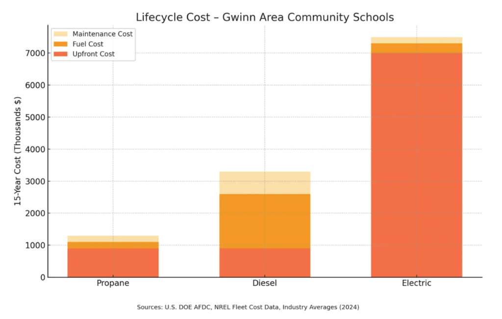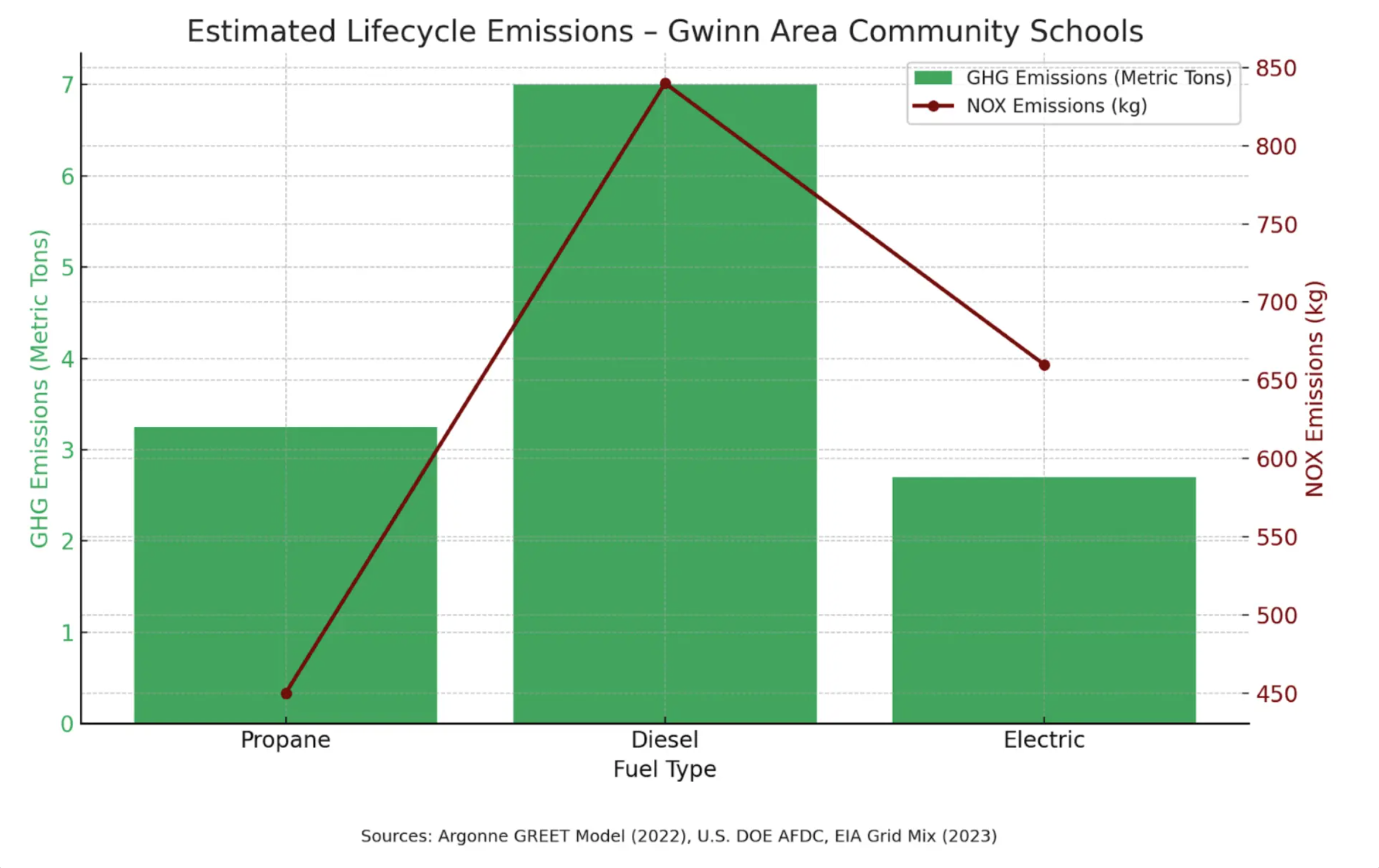 According to the U.S. Department of Energy Alternative Fuels Data Center (AFDC), propane buses emit up to 96% less nitrogen oxides than diesel buses. These harmful pollutants are associated with respiratory issues, particularly in children. By switching to propane, Gwinn helps protect student health while reducing its carbon footprint.